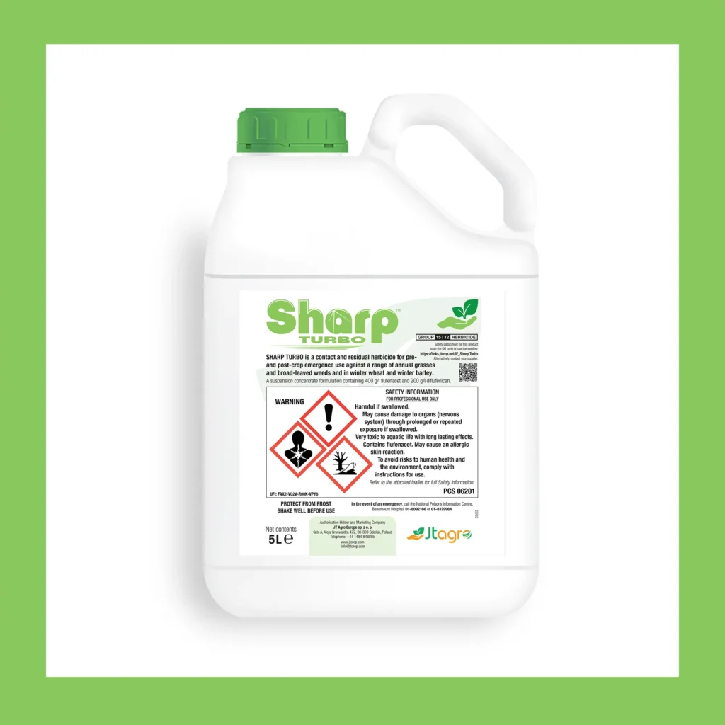 Is luibhicíd teagmhála agus iarmharach é SHARP TURBO le haghaidh úsáid réamh- agus iar-theacht chun cinn barr i gcoinne raon féar bliantúil agus fiailí leathanduilleacha agus i cruithneacht gheimhridh agus eorna gheimhridh.
